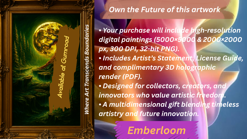 INSIDE THIS EXCLUSIVE PACKAGE: You will receive 1. MASTER ARTWORK – 5,000×5,000 px, 300 DPI, 32-bit PNG The definitive edition of Emberloom, crafted in museum-quality detail. Perfect for large-format printing, fine art display, or high-end digital applications. 2. COMPACT EDITION – 2,500×2,500 px, 300 DPI, 32-bit PNG Optimized for quick use across web, NFT platforms, and smaller design projects while maintaining full visual fidelity. 3. COMPLIMENTARY 3D HOLOGRAPHIC RENDER (PDF) and PNG A radiant reinterpretation of Emberloom, rendered as a shimmering holographic experience. This gift piece extends the artwork into multidimensional brilliance, suitable for collectors, NFT previews, or immersive digital showcases. 4. ARTIST’S STATEMENT (TXT/PDF) A beautifully written reflection detailing the vision, emotion, and creative depth behind Emberloom—offering both intellectual and emotional context to enrich your ownership experience.