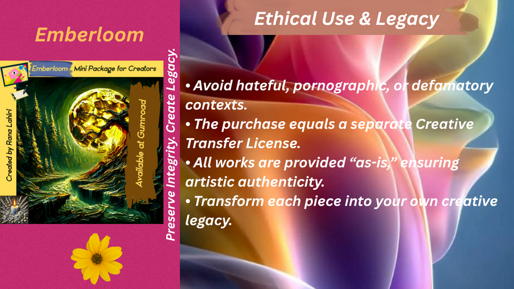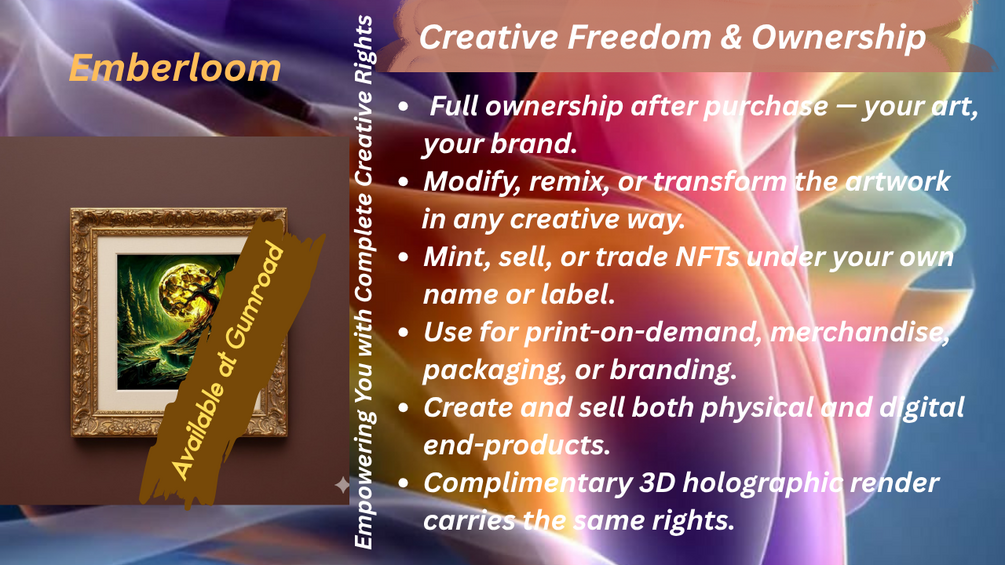 Under the Creative Transfer License and NFT Rights Agreement, you gain complete creative and commercial ownership. You are free to mint NFTs, design merchandise, create print-on-demand products, build brand visuals, or reinterpret the artwork in any way that reflects your personal or professional vision — without restrictions or attribution requirements. The only limitations are ethical and simple: The unaltered artwork cannot be resold on Gumroad or other similar sites, nor used in illegal, adult, or defamatory contexts.